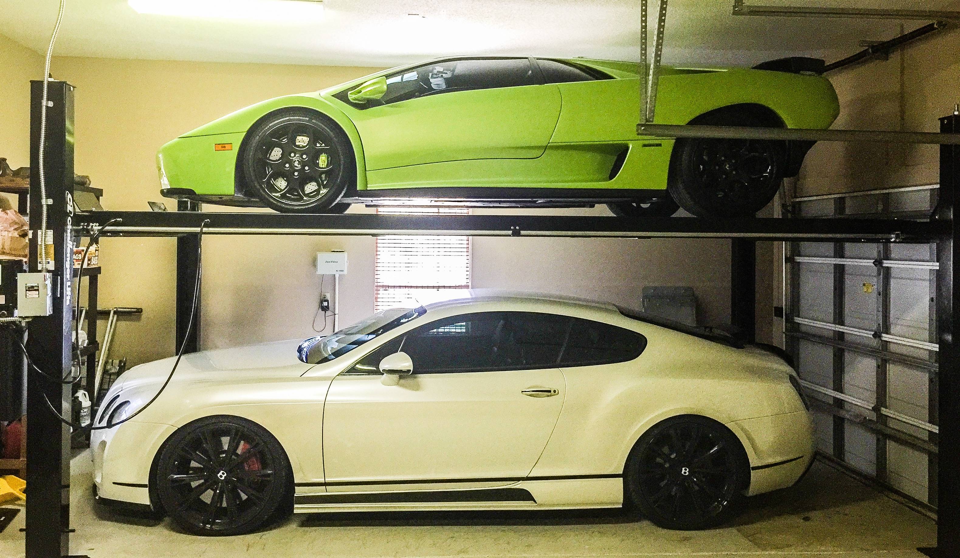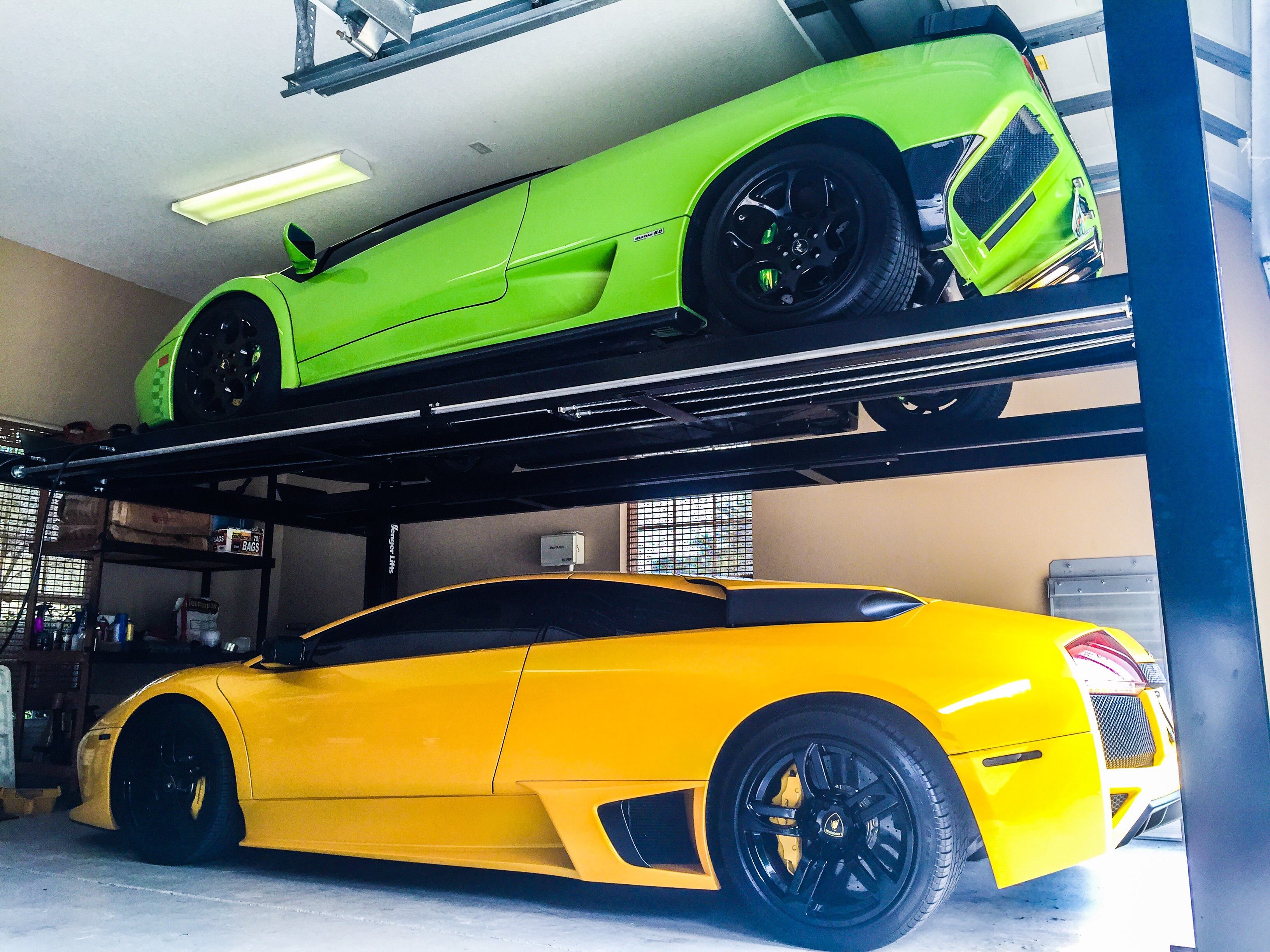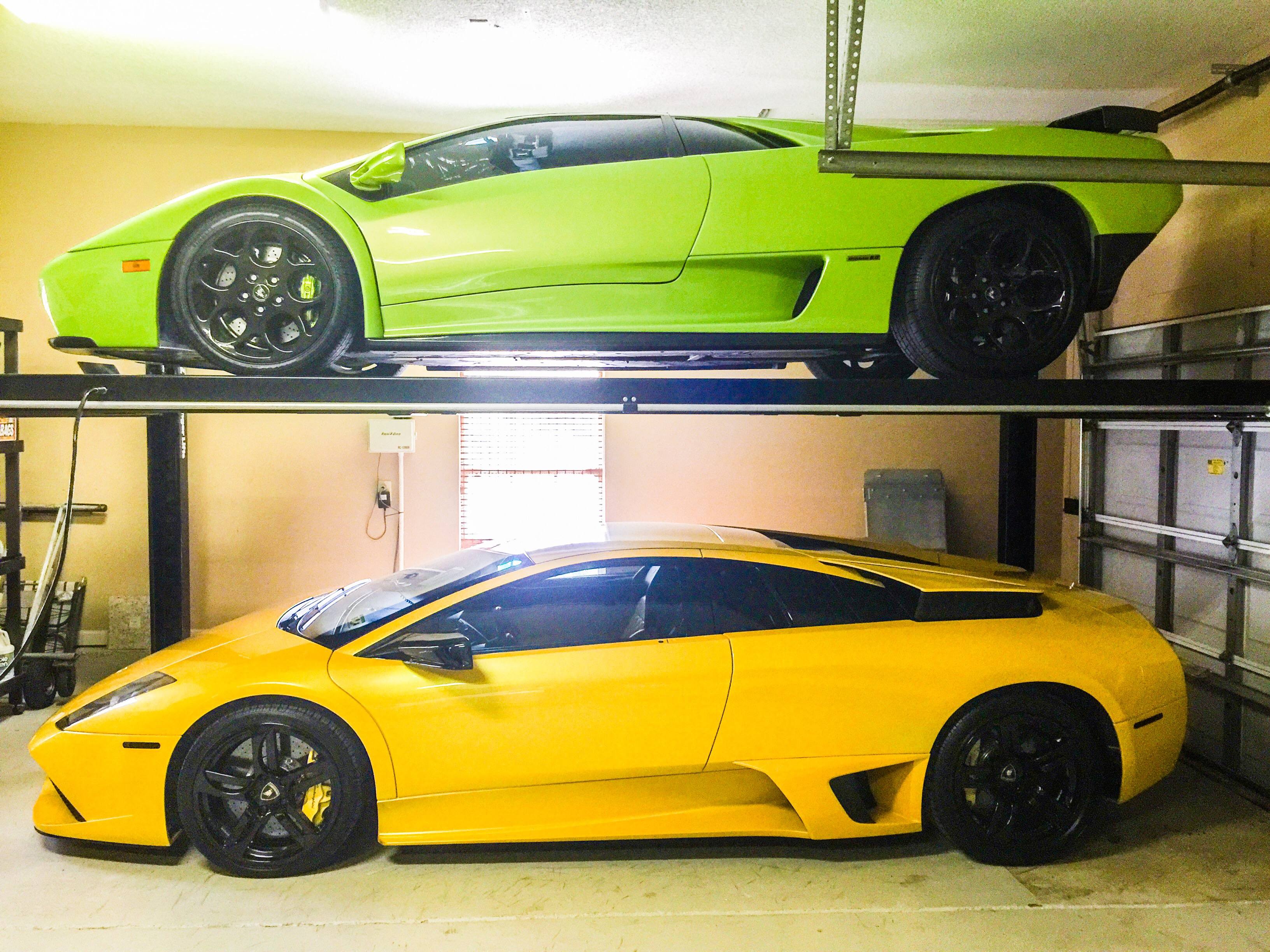 alpha6164 Report post Posted July 31, 2015 Very nice! My ceilings in my garage are 104 inches high. Do you think I can fit a Lambo uptop and another low car underneath with conventional doors? my tallest Lambo sits 45 inches high.. That is a pretty short ceiling. That is barley over 8 1/2 foot. The easiest way is to combine the height of both cars (whatever will be in the bottom plus the Lambo at 45"), add 6" for the height of the runways off the ground, and then add 8" room because you may be between 2 locks etc. So if height of the other car is 52"+45"+6"+8"= that is 111 which is not going to work. Even if you put 2 lamabos on top of each other it still wont work. Your option is to have a contractor possibly change the truss heights in the attic and raise your roof by a foot and a half. Quote Share this post Link to post Share on other sites More sharing options...